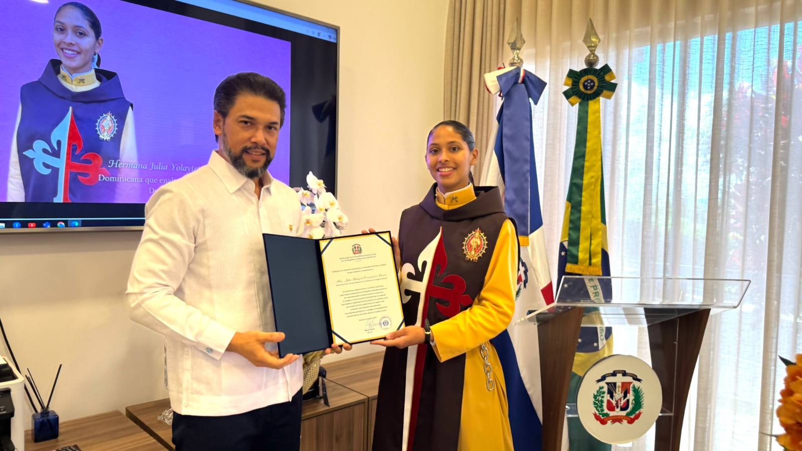 El acto se realizó en la sede de la misión diplomática y fue encabezado por el embajador extraordinario y plenipotenciario de la República Dominicana en Brasil, Robert Takata, quien resaltó que la labor de la religiosa refleja los valores de solidaridad y vocación de servicio del pueblo dominicano.